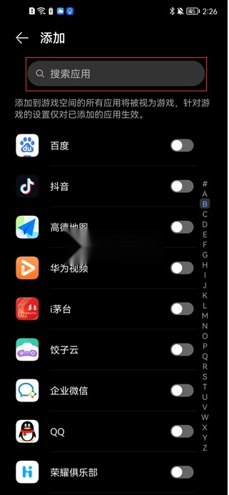 5、最后,在搜索框中输入你想添加的应用软件名称,找到后点击开关即可将其加入游戏空间。
