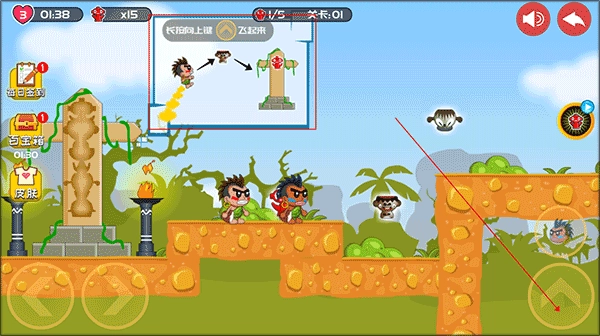1. 成功安装屁王兄弟手机版后,打开游戏,长按图中所示按键,角色就能飞起来。