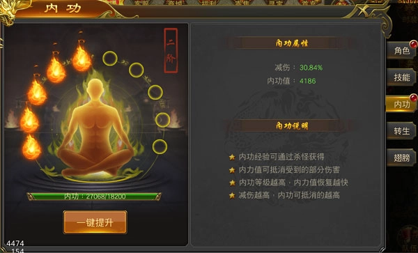 游戏过程中,玩家通过击杀怪物可获得一定的内功经验值。当内功经验值达到一定的值时,玩家可点击一键提升,以提升内功等级。战斗中受到伤害时,系统将根据玩家的内功等级,按减伤的比例优先扣除内力值,内力值为空时,则扣除生命值。玩家内功等级越高,减伤比例和内力值越高,内力值恢复也越快。