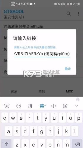 3、然后点击界面的mod按钮,粘贴链接(删除访问码),记住访问码