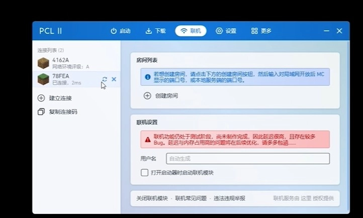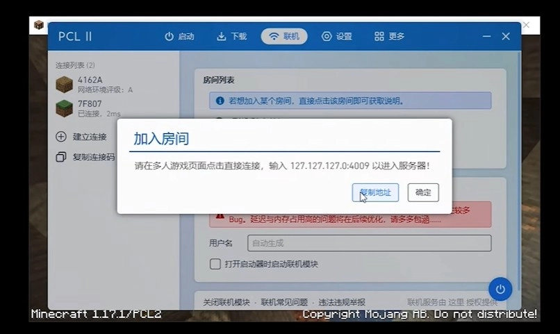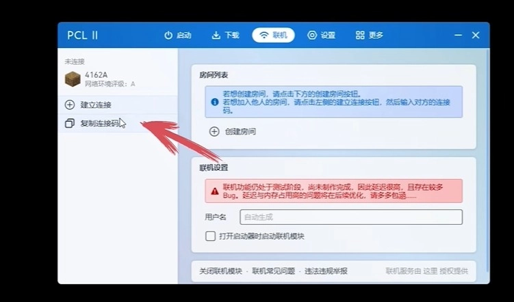 进入后,点击左侧的复制链接码,把这条神秘代码发送给你的朋友,让他在PCL中点击建立连接。