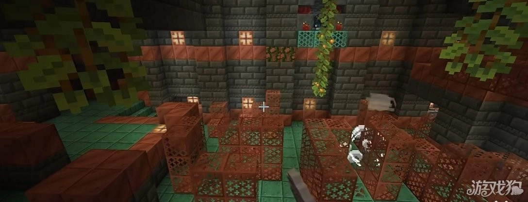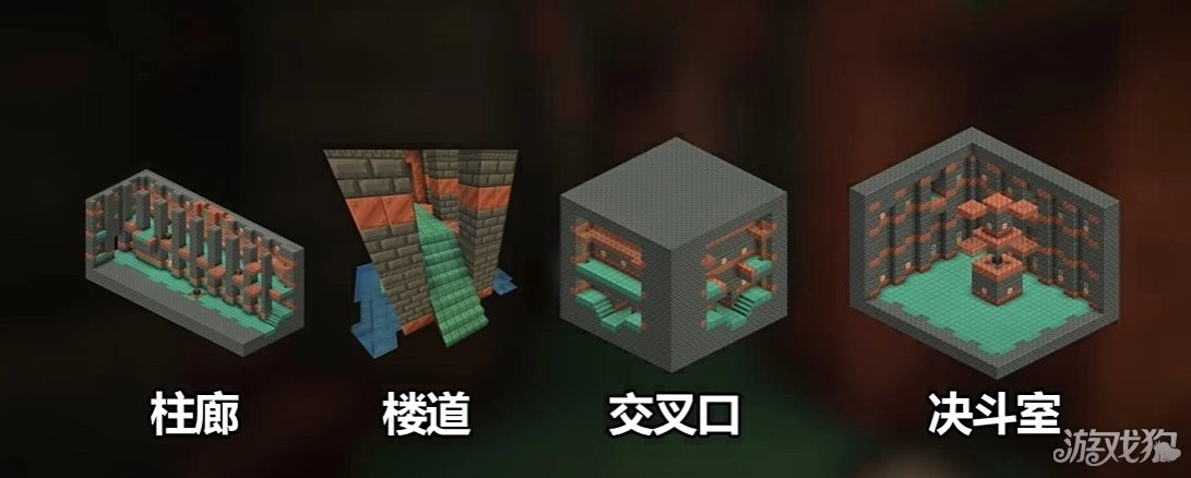 主要分成了柱廊、楼道、交叉口、决斗室,组成它的方块大多为铜变种和凝灰岩变种