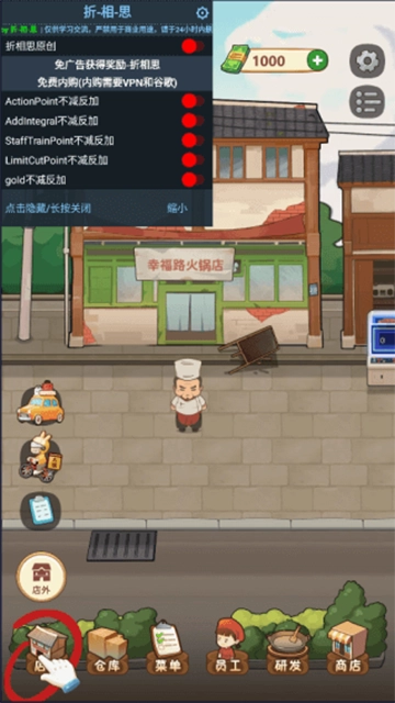 3、在商店~道具里边,用金钱买道具,合成后可以获得食材或者元素,用来研发新火锅或新菜品,大家要记住,能用钱解决的都不是问题(现在挂机可以得金钱)