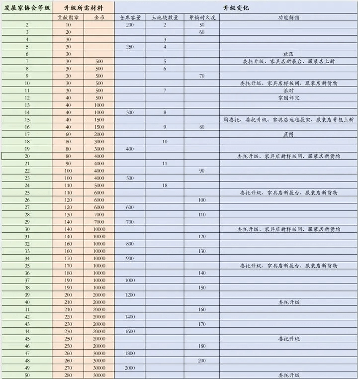 发展家协会,相当于心动小镇的游戏等级系统,通过提升等级能够解锁相应的功能,以及提高仓库容量、土地块数量、斧镐耐久度等上限,能够方便我们体验更多新内容。