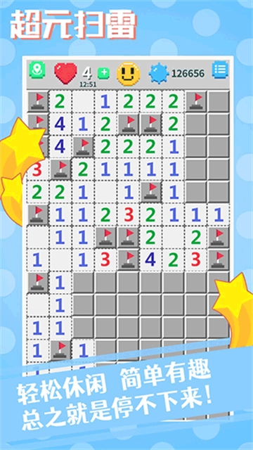 超元扫雷,一款既好玩又烧脑的趣味扫雷游戏。其画风简约清晰,画面采用像素风格展现。闲暇之时,你不妨拿出这款游戏,轻松打发无聊时光。 在这款游戏中,不仅保留了经典的扫雷玩法,还增添了多人同屏的扫雷模式。玩家需开动脑筋,成功避开所有地雷,翻开全部安全区域,方可赢得最终胜利。这里有众多真人玩家竞相争夺排名,感兴趣的玩家,快来争夺属于自己的“领地”吧!