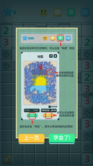 4、第三个图标点开后我们可以看到整个扫雷地图的全貌,如果你想扫雷就点一下随机然后点传送就可以传送到别人还没扫过的地方就可以开始扫雷啦。