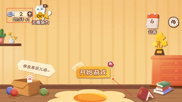 1. 当玩家进入游戏主页,在页面左上角能够查看自身剩余的体力值。接着,点击“开始游戏”,就能开启收纳之旅。