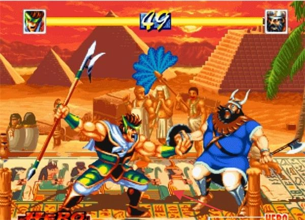1. 挑选角色(例如绿衣长枪角色、蓝衣巨汉角色),处于埃及场景(红箭头所指处),通过方向键进行移动,利用摇杆按键释放技能(比如长枪突刺)。
