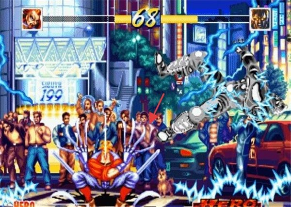 3、切换现代城市场景(红箭头),操控新角色(红袍),释放大范围技能(如雷电抓取),击飞敌人,赢取胜利。