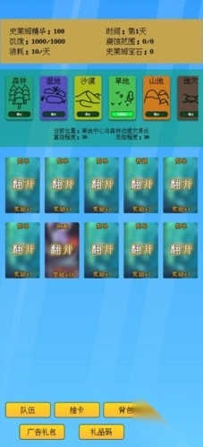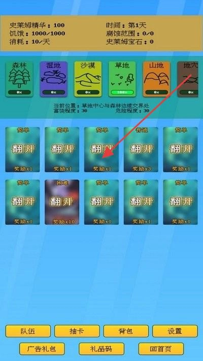 3、探索界面选区域(如草地),按难度“翻开”获取奖励,留意“史莱姆精华”“饥饿”属性,用【队伍】【背包】管理养成。