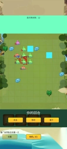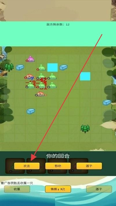 2、战斗时,依据“你的回合”,用【移动】调整位置,【攻击】敌方,合理【落子】布局,善用“看广告收服”机制扩队伍。