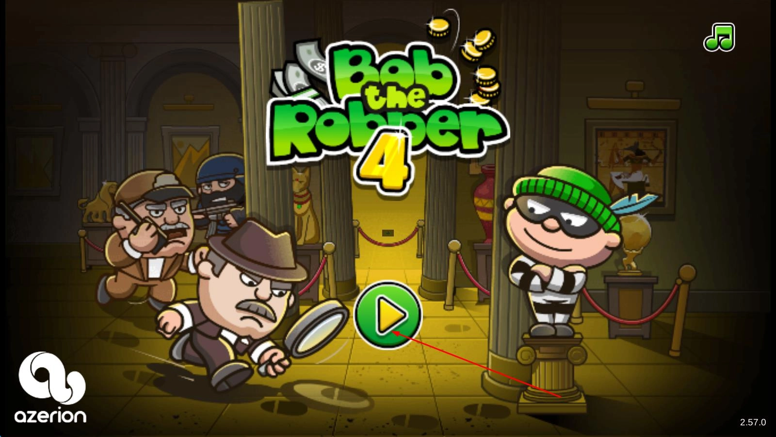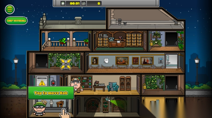 1. 安装完成后启动游戏,通过点击屏幕操控鲍勃移动,当靠近门口时,点击离开图标以切换场景,进而开启盗窃任务。