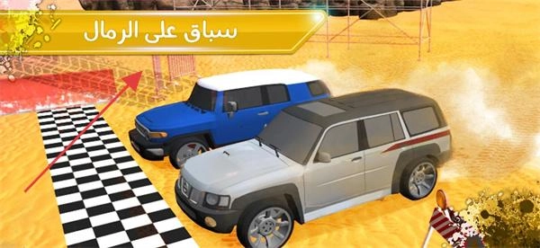 1、首图文字为“تطعيس في وادات صحراوية”(意即“在沙漠河谷中驰骋”),点击越野车,即可开启沙漠竞速之旅。