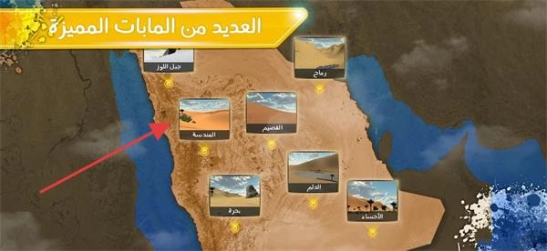 3、地图页“العديد من العابات المميزة”(多种精彩地形),选沙漠区域,驾驶越野车,避障碍、超对手,完成比赛。