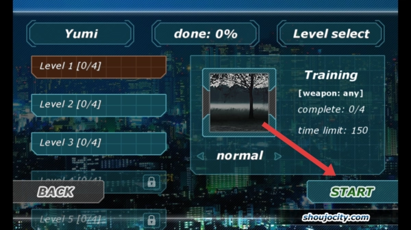 3、在关卡选择界面选定Training训练关卡后,点击【START】,开启基础射击训练,熟悉游戏操作。