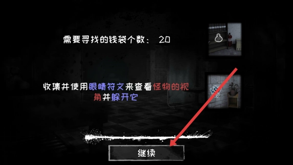 2、查看任务提示“寻找20个钱袋”,点击【继续】,进入场景,准备收集钱袋,躲避怪物。