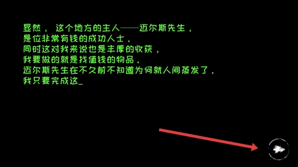 1. 阅读剧情文字,知晓“寻找迈尔斯先生值钱物品”的背景,点击箭头所指位置的按钮,推动游戏进程。