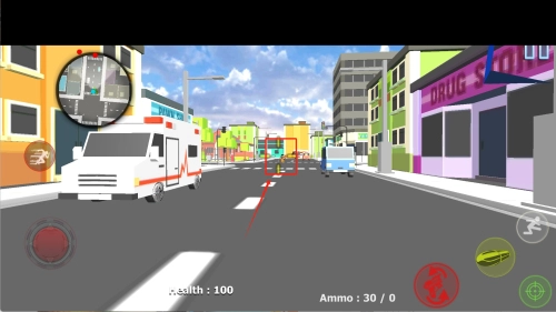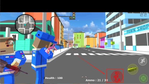 3、通过左下角移动键穿梭建筑间,使用右下角攻击键消灭敌人,注意上方小地图和30/0弹药提示,及时拾取DRUG补充生命值。