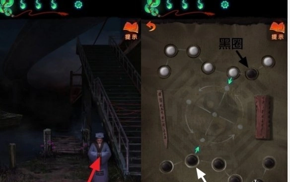 1、黑圈机关:右侧机关图中,黑圈为核心节点,需按绿色箭头指引连接白圈,形成回路(箭头指向的节点顺序),可能对应签文“示运之物固关己”的布局暗示。