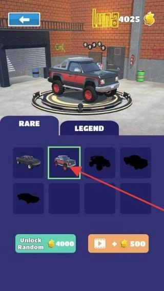 1. 在车库页面,既能够花费金币,点击【Unlock Random】来解锁新车辆,也可以通过观看广告获取金币,从而扩充车辆库。