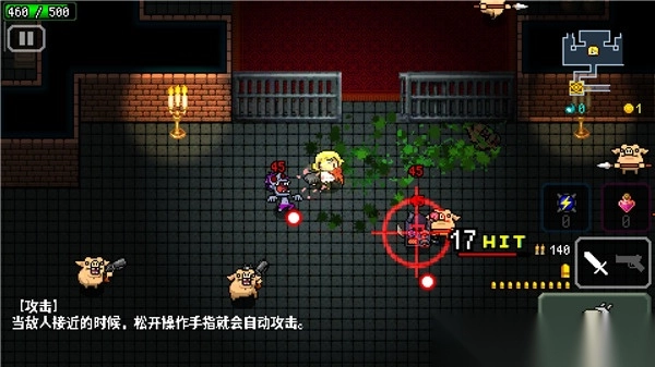 2、像素血腥风格:采用像素画面呈现血腥暴力元素,战斗中怪物炸裂的视觉效果极具冲击力,营造出独特的暗黑系视觉氛围。