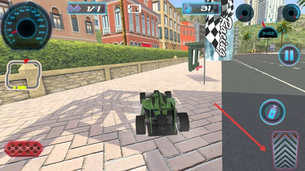 3、操控赛车在道路行驶,用右侧按键加速、转向,避对手、沿赛道跑完全程。