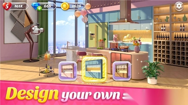 3、带着关卡收益进入装修环节,浏览风格各异的装饰选项,从家具、壁纸到摆件,精心挑选,将心仪装饰品布置到房间,打造独特风格,完成后可进入下一阶段挑战。