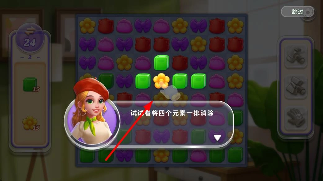 1. 初次进入页面,映入眼帘的是消除关卡界面。此时,需仔细留意元素的分布情况,通过交换瓷砖位置,让3个及以上相似瓷砖连成一线,从而实现消除操作,这便是获取启动资金的第一步。
