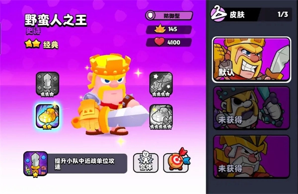 1. 野蛮人之王:拥有史诗品质,等级为145 ,生命值达4100 。其定位是防御型,技能能够提高小队近战单位的攻击速度。该角色有包括默认皮肤在内的3款皮肤,目前已解锁1款(共3款)。在团队中充当前排,借助增益buff来强化近战协作。