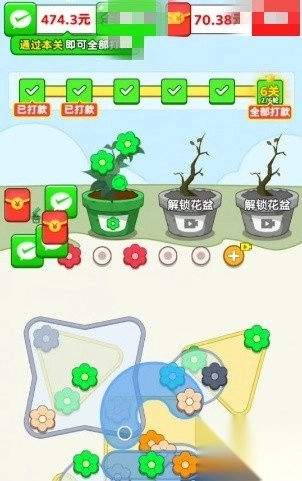 1. 游戏别出心裁地把解锁螺丝与花朵消除这两种玩法融合在一起,玩家得先拧开螺丝,方可把螺丝钉放进花盆里达成消除效果。