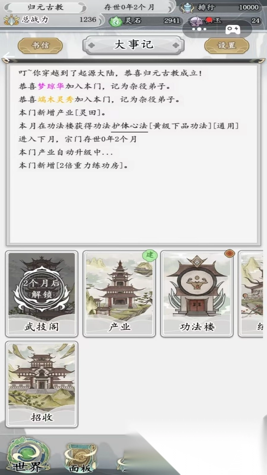 1. 玩家可以解锁众多功能性设施,像武技阁、炼丹房、锻造坊、天河瀑以及太虚塔等。