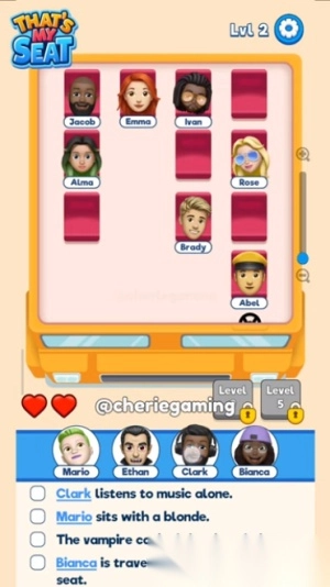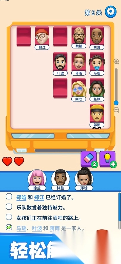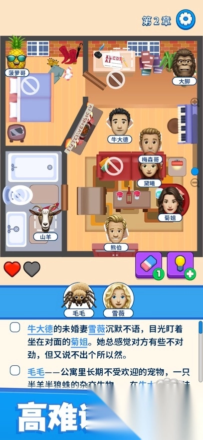 1随着关卡逐步解锁,你会结识到越来越多的人物。这些人物之间错综复杂的人际关系,会给你的座位安排计划增添不少难度,需要你绞尽脑汁,才能做出合理的安排。