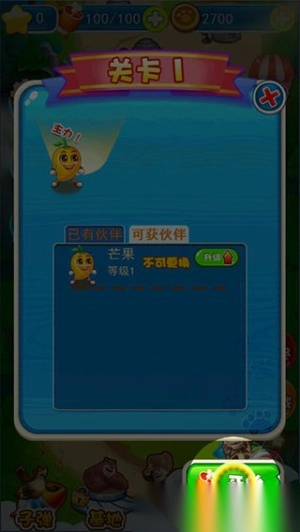3.在关卡的准备界面可以看到已有的水果伙伴,目前仅有芒果这一个伙伴,点击右下角的开始按钮,消耗5点体力值开始闯关。
