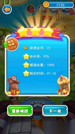6.成功通关后就会收到关卡总结,里面会显示获得金币的数量、命中率、城墙血量和剩余时间,可以选择重新桃战或者开始下一关。