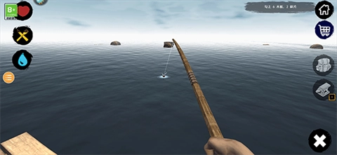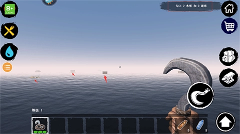 3、为了生存,玩家需要扩建我的木筏,必须制作1把锤子,先钩上来一些物资保存体力。