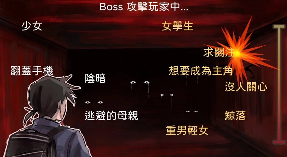 BOSS 战与辩论环节呼应,假设第一辩论环节是跟小女孩进行,那么 BOSS 环节第一回合便会是与小女孩相关的词汇。