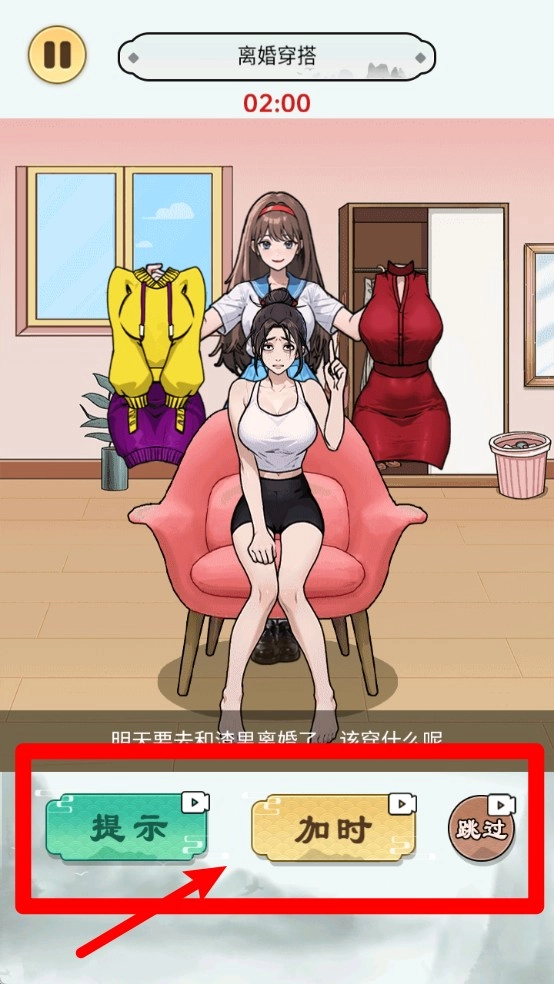 1.当玩家遇到难题时,可点击下方的“提示”“加时”“跳过”按钮获得穿搭建议,帮助顺利通关。