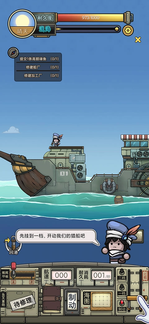 1. 你身为方舟上唯一猎船的船长,必须持续出海捕猎,以此满足人们的饮食需求,并为方舟的升级与修理寻觅材料。