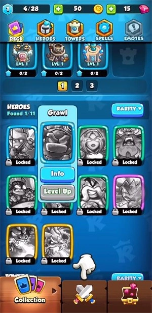 7、在游戏主界面点击下方第一个按钮可以更换上阵的英雄、防御塔和使用的法术。