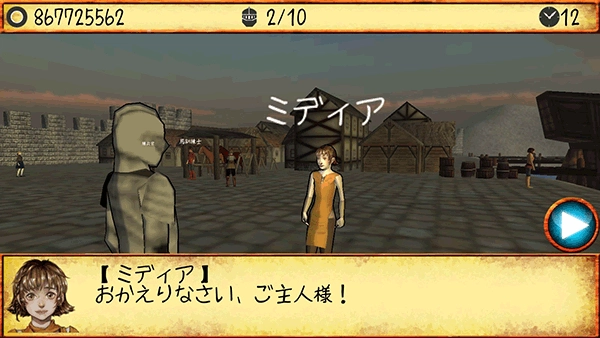 2、游戏开始后,人物是在一艘船上,正在和一个人对话,点击右下角的三角箭头即可。之后去和对面的头上有名字的人对话,一番对话后就可以进入大陆了