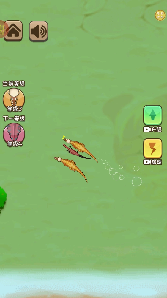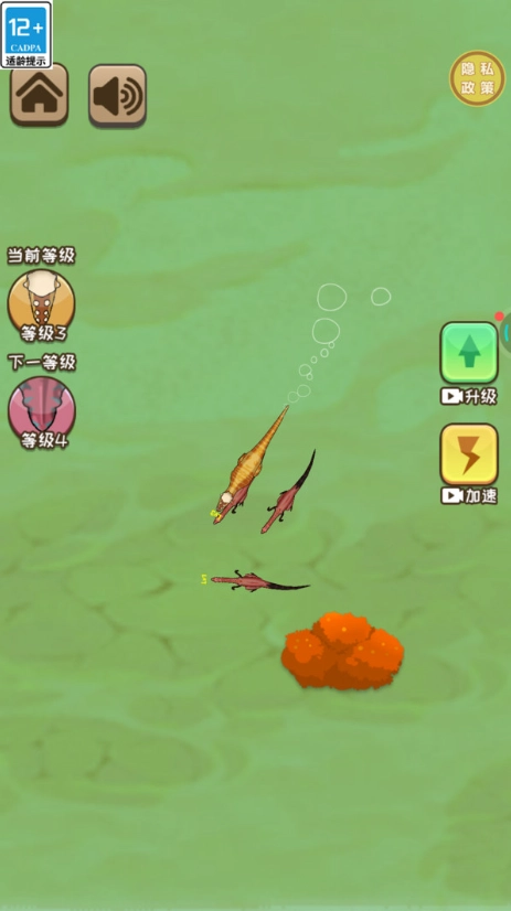 核心机制: 体型压制:只能吞噬比自己小的生物 能量获取:不同生物提供差异化能量 兔子+5点 剑龙+20点 特殊金色生物+50点 危险警示: 红色边框:致命天敌(立即逃离) 黄色边框:同级对手(可能反杀)