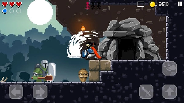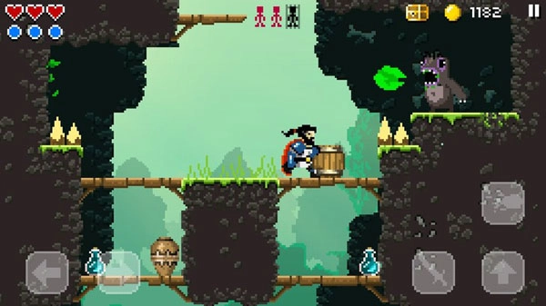 我先来说说游戏的操作吧,游戏的左边是左右方向键,右边是挥砍和跳跃键、释放魔法,最初的几个关卡我们只能简单地攻击,到了后面学会魔法之后就能使用火球术之类的技能了,游戏的操作总体来说还是非常的简单控制起来也不难,更大程度上考验的是我们对关卡地形和一些细节的操作。