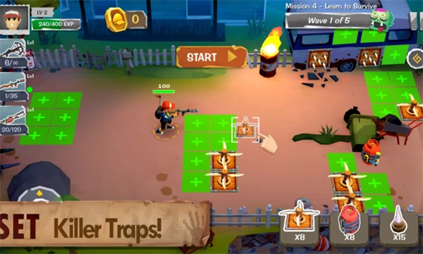 1、在僵尸来袭前设置陷阱并选择最佳武器。