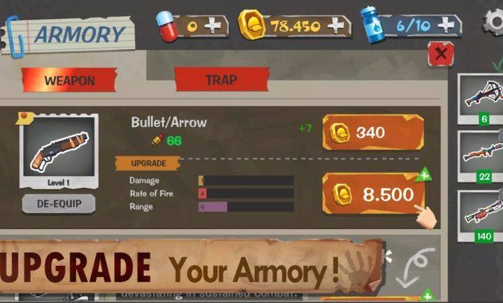 3、升级你的武器库 - 解锁并强化枪支、炸药和防御工事。