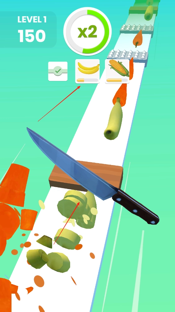 1. 轻点屏幕,控制小刀落下切割食材。关卡上方会展示本关菜肴所需食材,收集到目标数量就算达成。