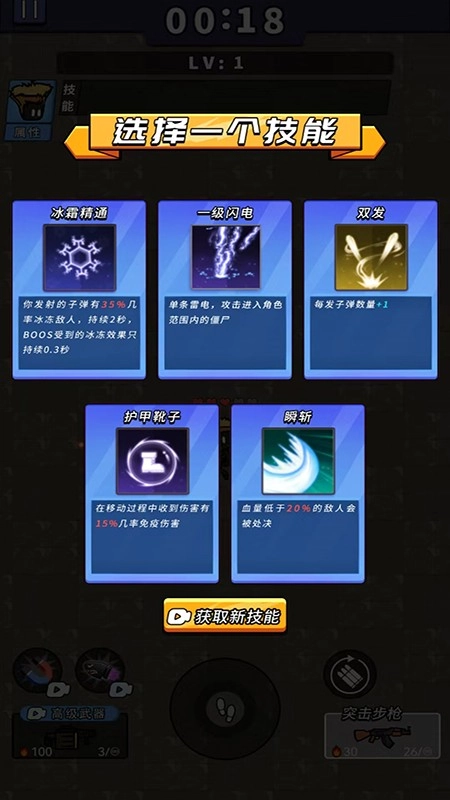 2、战斗中解锁并选择技能,如一级闪电瞬斩等,通过技能组合提升战斗力,应对不同类型的感染者和Boss挑战。