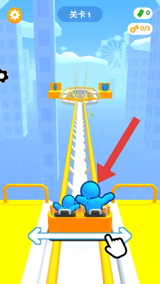 1. 展示关卡1的具体内容,玩家控制蓝色小人搭乘过山车,顺着轨道向前行进,要借助左右滑动之类的操作来应对轨道上的种种挑战。