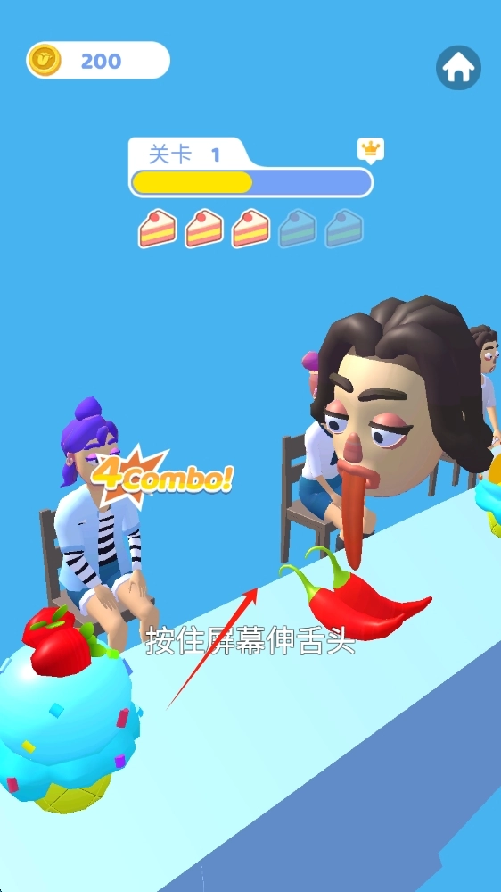 2、在游戏内操作界面,按住屏幕控制角色伸舌头,品尝各种美食,获取积分和金币。