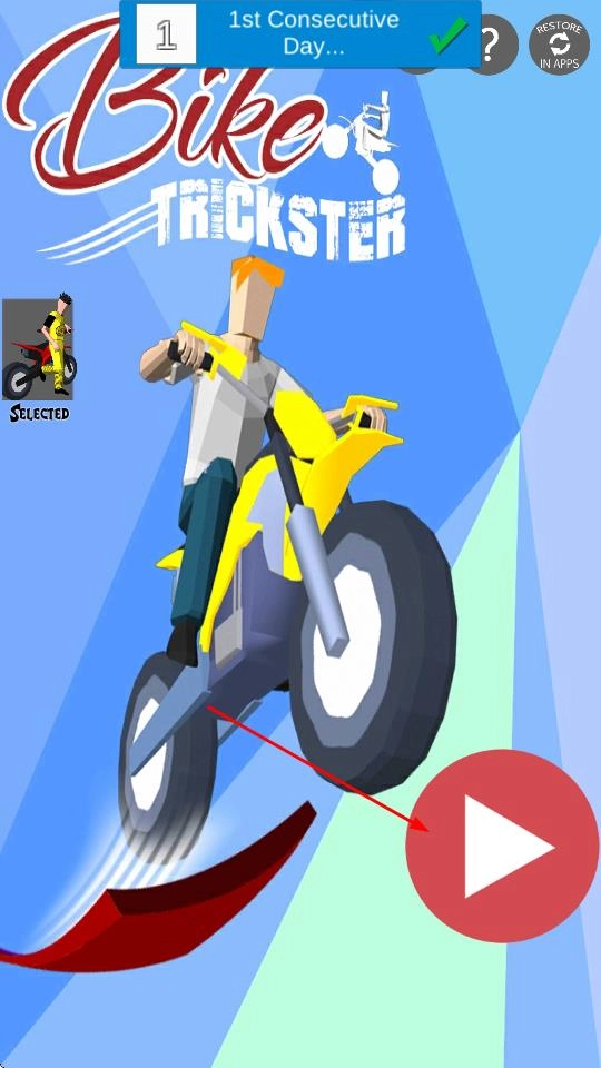 1. 在主界面找到红色播放按钮并点击,选中黄色摩托和角色,就能进入赛道,开启特技骑行挑战,投身到满是障碍的骑行冒险之中。