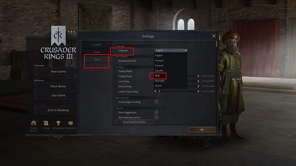 4、点击菜单下面的settings选项,点击game,将language后面调为中文点击ok,最后重启游戏即可;